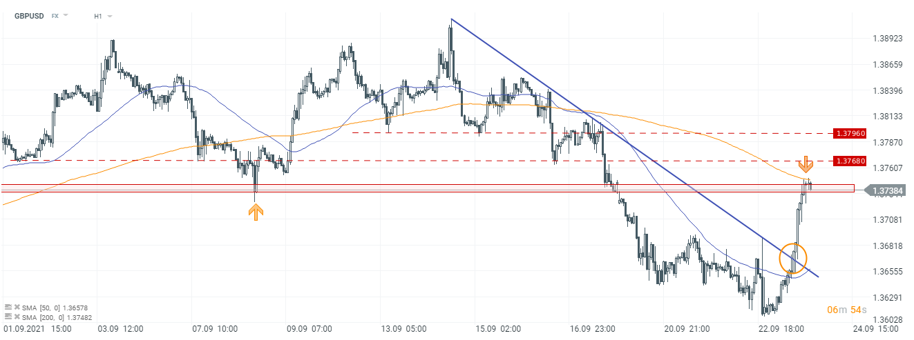 Patrząc na wykres godzinowy GBPUSD, doszło dziś do wybicia linii lokalnego trendu spadkowego. Funt silnie się umocnił, a para powróciła powyżej 50-godzinnej średniej kroczącej. Obecnie testowane są dołki z 8 września oraz 200-godzinna średnia krocząca - dotychczas stronie popytowej nie udało się dokonać wybicia w górę. Patrząc na poprzednie reakcje cenowe, kolejnymi ważnymi poziomami horyzontalnymi mogą być: 1,3768 i 1,3796. Źródło: xStation5