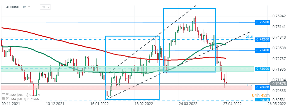Para AUDUSD gwałtownie wzrosła podczas wczesnej sesji europejskiej, jednak nastroje pogorszyły się po tym, jak na rynek weszły transakcje z USA. Kupującym nie udało się przebić powyżej głównego oporu na poziomie 0,7200, który jest wyznaczony przez poprzednie reakcje cenowe, a para wznowiła ruch spadkowy i obecnie zmierza w kierunku głównego wsparcia na poziomie 0,7060, który jest wyznaczony przez 38,2% zniesienie Fibonacciego fali wzrostowej rozpoczętej w marcu 2020 r. Źródło: xStation5