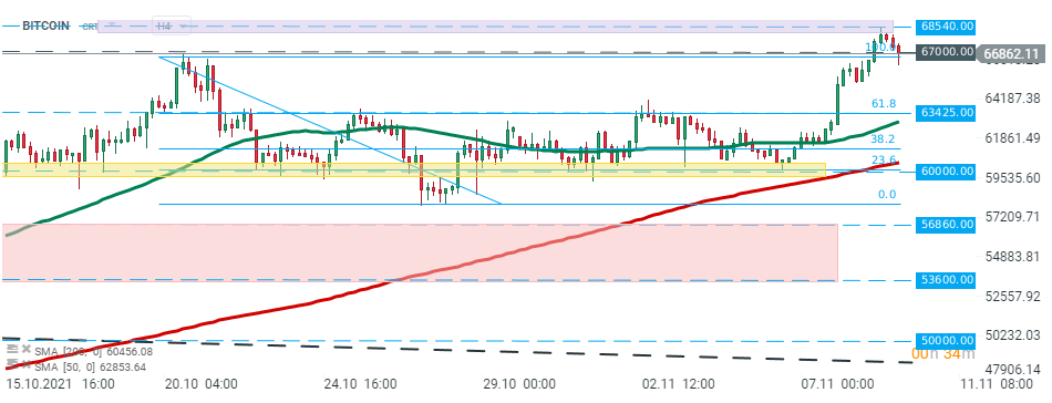 Cena BITCOINA przedłużyła wczorajsze wzrosty i osiągnęła nowy rekordowy poziom 68 540 USD, jednak w dalszej części sesji momentum wzrostowe wygasło i cena cofnęła się do poprzedniego szczytu na poziomie 67 000 USD. Jeżeli dojdzie do przełamania, wówczas korekta spadkowa może pogłębić się w kierunku poziomu 63 425 USD, który zbiega się z 50 okresową średnią kroczącą (zielona linia) oraz poziomem 61.8% zniesienia Fibonacciego ostatniej fali spadkowej. Źródło: xStation 5