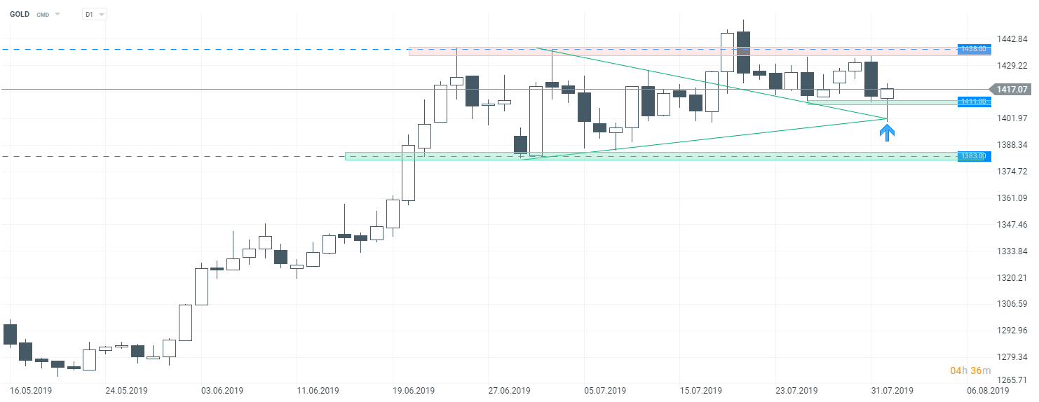 Patrząc z kolei na rynek surowcowy, należy zwrócić uwagę na rynek złota. Złoto po nie najlepszej pierwszej połowie sesji, wychodzi na plus, tym samym na interwale D1 może pojawić się dziś pro wzrostowa formacja młota. Tym samym istnieje szansa, że jutro ruch wzrostowy będzie kontynuowany.
