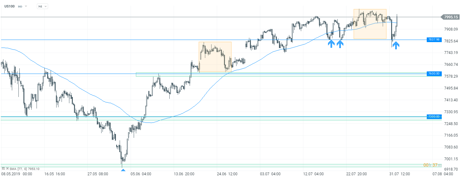 Giełdy w USA prawdopodobnie zakończą dzisiejszą sesję na solidnym plusie. Po wczorajszych spadkach w zasadzie nie widać już śladu. Podczas konferencji FED mogliśmy obserwować wyraźny ruch w dół, niemniej jak widać po wykresie, inwestorzy wykorzystali chwilową korektę do zakupów. Niewykluczone, że jutro, bądź po weekendzie zobaczymy atak na ostatnie szczyty. Przyglądając się sytuacji na US100, cena dotarła do wsparcia wynikającego z ostatnich dołków, a także równości z największa korektą na ostatnim ruchu wzrostowym, gdzie pojawiła się reakcja popytu. Tak długo jak indeks znajduje się powyżej poziomu 7838 pkt, obowiązuje tendencja wzrostowa.