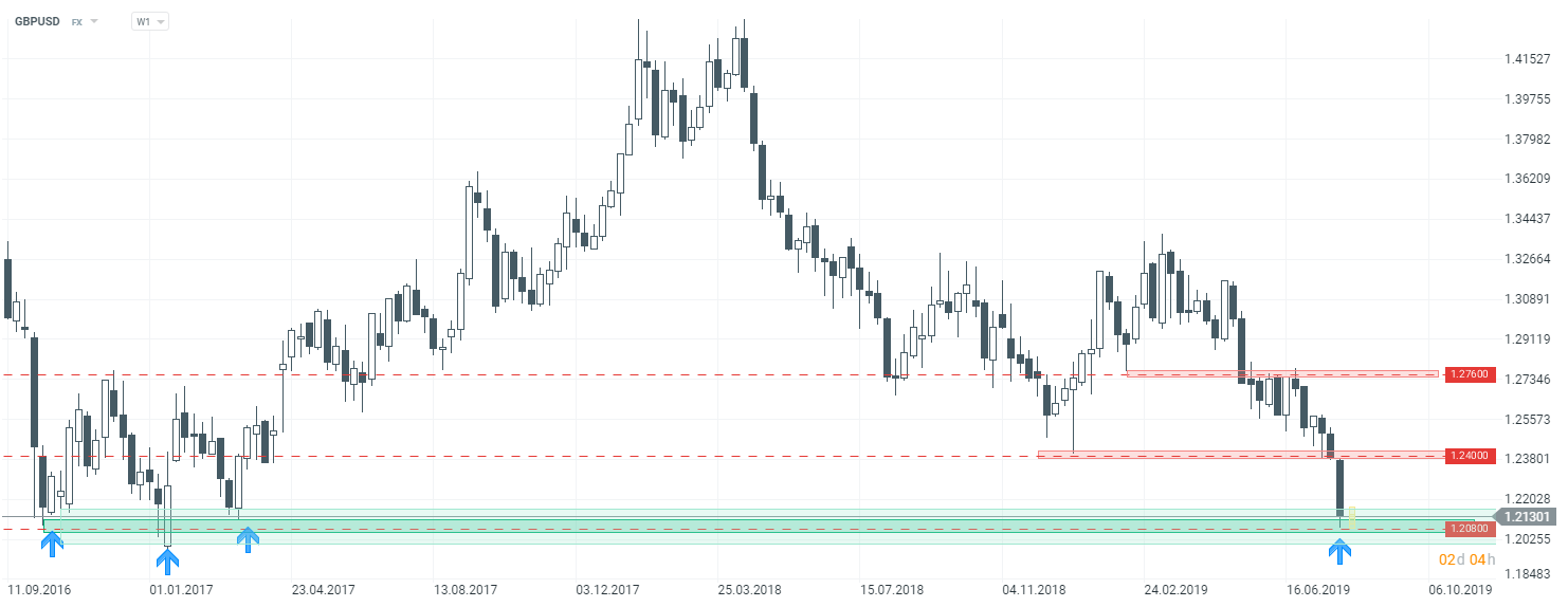 Podczas środowej sesji poznaliśmy sporo odczytów makroekonomicznych. Między innymi były to wskaźniki PMI, a także przemysłowy ISM dla Stanów Zjednoczonych. Najważniejszym wydarzeniem dzisiejszego dnia była jednak decyzja Banku Anglii w sprawie stóp procentowych. Tak jak oczekiwał tego rynek, bank centralny nie zdecydował się na cięcia, stopy pozostały na poziomie 0,75%. Kurs funta nie wykazywał większej reakcji, a to z racji braku zaskoczenia. Podczas konferencji prasowej, prezes Mark Carney również nie powiedział nic nowego. Bank odniósł się do obecnej sytuacji związanej z wyjściem Wielkiej Brytanii z Unii Europejskiej, jego zdaniem ryzyko hard Brexitu jest coraz większe. Dodatkowo globalna sytuacja gospodarcza nie jest najlepsza. Ostatecznie w godzinach popołudniowych kurs GBPUSD zyskuje, jednak jest to raczej konsekwencja nieco gorszych odczytów ze Stanów Zjednoczonych. Trzeba pamieć, że główny trend jest spadkowy i nawet większa korekta nie powinna mu zagrozić. Jeśli ostatecznie dojdzie do Brexitu bez umowy, kurs funta może dalej tracić. Patrząc na wykres technicznie, cena nieznacznie odbija od kluczowego wsparcia, gdzie wypadają dołki z 2017 roku. Z perspektywy samego wykresu, jest to na pewno dobre miejsce do wykonania kontry, niemniej łapanie dołka, przy tak silnym trendzie nigdy nie jest dobrym pomysłem.