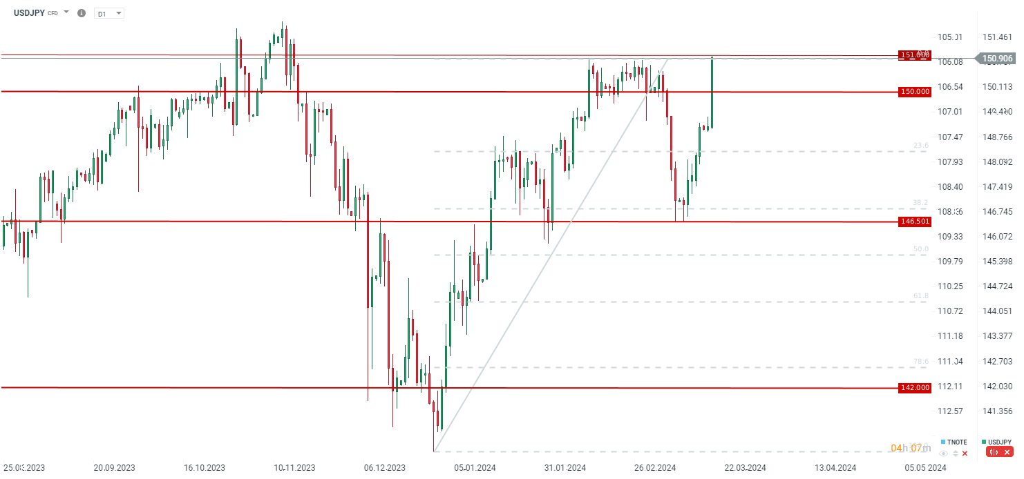 USDJPY notuje mocne wzrosty i testuje niemal 151. Jeśli Fed będzie gołębi, jest szansa na korektę, ale z drugiej strony ewentualnie mocniejszy jen w długim terminie będzie zależał od możliwości wprowadzenia stopniowych podwyżek przez BoJ. Źródło: xStation5