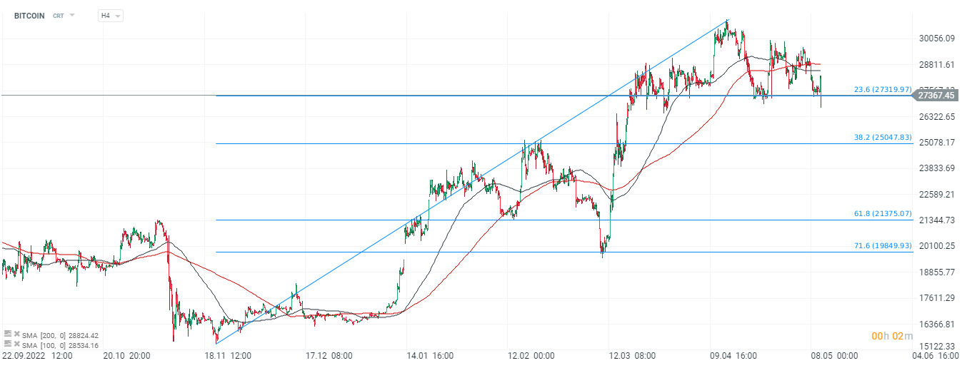 Bitcoin, interwał H4. Cena gwałtownie zanurkowała poniżej 27,500 USD, gdzie popyt na poziomie 23,6 zniesienia Fibo próbuje powstrzymać podaż. Średnie SMA200 i SMA100 uformowały niedźwiedzia formację 'krzyża śmierci', na interwale H4. Formacja może sygnalizować, że momentum stopniowo odwraca się na korzyść sprzedających. Źródło: xStation5