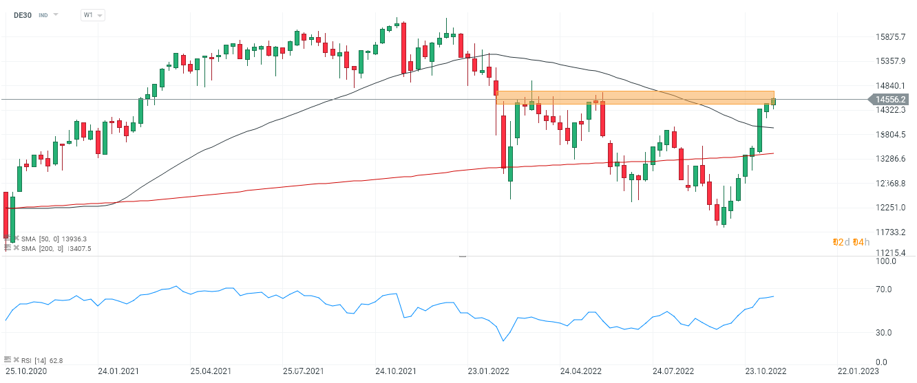 Kontrakty na DE30 zanotowały dziś kolejną udaną sesję i rosną 8 tydzień z rzędu przedłużając wzrostową passę. Wracają do poziomów z 23 lutego, wymazując całkowicie spadki spowodowane wybuchem wojny w Ukrainie. Indeks znajduje się na istotnych poziomach (spadkowe reakcje cenowe z marca i czerwca), z których potencjalnie może zostać uruchomiony korygujący wzrosty impuls spadkowy. Korekta może zbliżać się wielkimi krokami zwłaszcza biorąc pod uwagę wciąż mgliste perspektywy dla europejskiej gospodarki i niepewną sytuację na rynku energii. Jeśli spadki wystąpią pierwszą strefą wsparcia mogą stać się poziomy 50 sesyjnej średniej (kolor czarny), przebiegające obecnie w okolicach 14 000 pkt. Z kolei pokonanie strefy 14 600 pkt, może otworzyć niemieckiemu benchamrkowi drogę w kierunku 15 000 pkt. Indeks prawdopodobnie pozostanie ekstremalnie wrażliwy na kolejny odczyt inflacji, który poznamy w grudniu. Inwestorzy w Europie chcieliby żeby presja cenowa osłabiała się w tempie porównywalnym z amerykańską gospodarką. Patrzac jednak na istotny w niej udział cen energii nie wydaje się to bardzo prawdopodobne. Co ciekawe kontrakty na niemiecki indeks wymazały spadki szybciej od US500, który wciąż notowany jest w okolicach poziomów obserwowanych w czerwcu i wrześniu 2022 roku. Źródło: xStation5