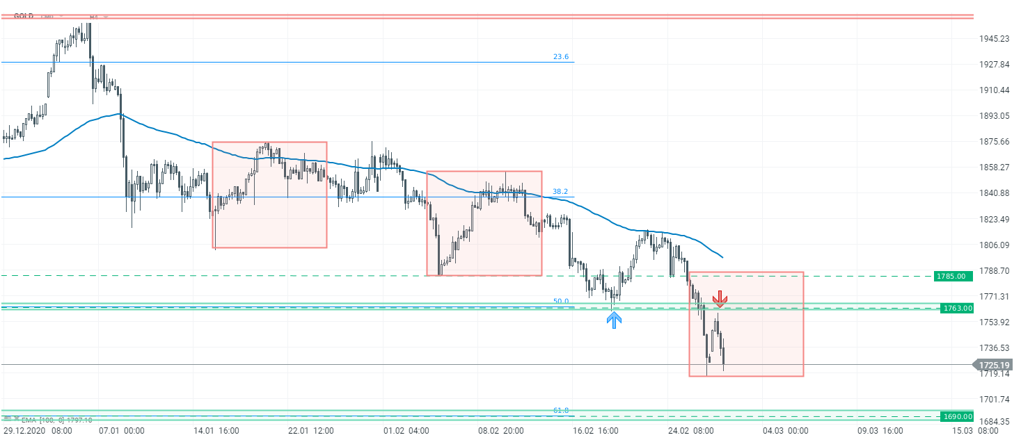 Notowania złota kontynuują ruch w ramach trendu spadkowego. Najbliższe warte uwagi wsparcie znajduje się przy poziomie 1690$, gdzie znajduje się mierzenie 61,8% z interwału D1. Źródło: xStation5