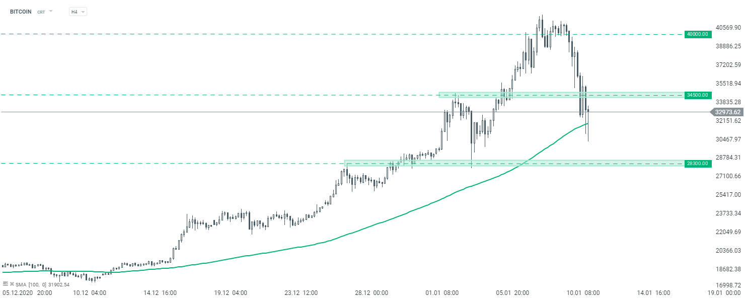 Bitcoin nie zagościł długo powyżej poziomu 40 tys. dolarów. Licząc od ostatnio ustanowionego maksimum, przecena sięgnęła ponad 10 tys. USD, przez co doszło do testu średniej kroczącej z ostatnich 100 okresów, gdzie dziś pojawiła się odpowiedź kupujących. W przypadku odreagowania, najbliższy opór powinny stanowić okolice poziomu 34500 USD. Jeżeli jednak przecena zostanie pogłębiona, jako najbliższe wsparcie należy traktować poziom 28300 USD. Jego przełamanie może spowodować, że rynkowe byki znajdą się w tarapatach.