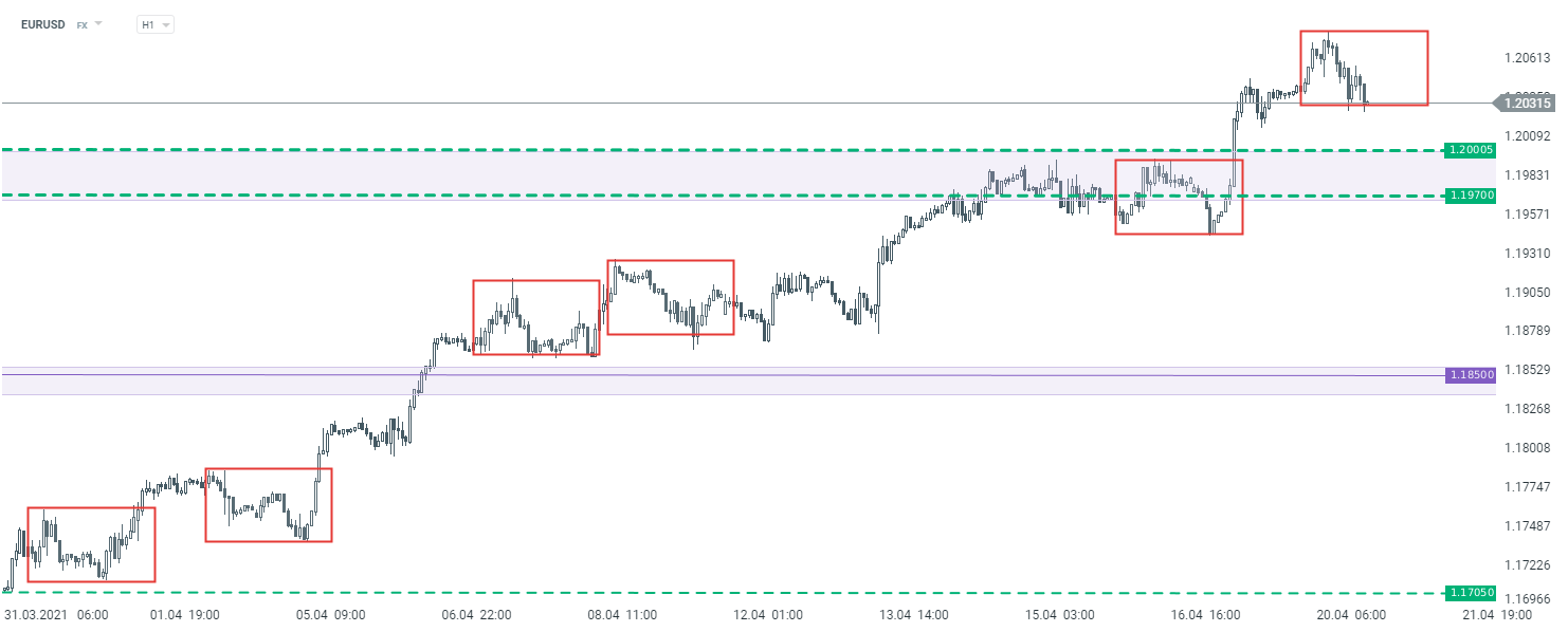 Pomimo dzisiejszej korekty na EURUSD, tendencja w ostatnim czasie pozostaje wzrostowa. Aktualnie notowania walczą na wysokości dolnego ograniczenia układu 1:1. W przypadku pojawianie się tutaj kupujących, możliwe będzie wygenerowanie kolejnego impulsu wzrostowego. Jednak jeżeli zostanie on zanegowany, przecena może sięgnąć strefy wsparcia przy 1,20 -1,1970, która wynika z interwał H4.