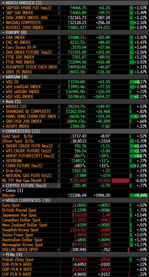 Pod względem procentowym to do rynku krypto przypada tytuł największego beneficjenta dzisiejszej sesji. Bitcoin zyskuje ponad 10% i wraca powyżej 21 000 USD. Ethereum radzi sobie gorzej, zyskując „tylko” 4,5%.