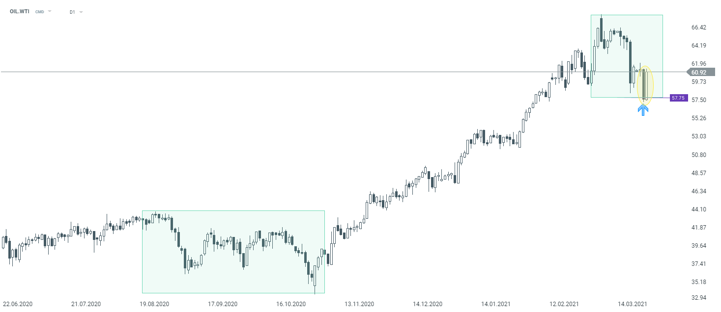 Parząc technicznie na wykres ropy WTI, możemy obserwować odbicie na wysokości kluczowego poziomu technicznego. Kupujący pojawili się przy poziomie 57,75$, który wynika z dolnego ograniczenia układu 1:1, który jest największą korektą na całej ostatniej fali wzrostowej, trwającej od kwietnia 2020 roku. Do końca sesji już niewiele czasu, a wszystko wskazuje na utworzenie się pro wzrostowej formacji świecowej - objęcie hossy, co może świadczyć o zakończeniu korekty i powrocie do wzrostów.