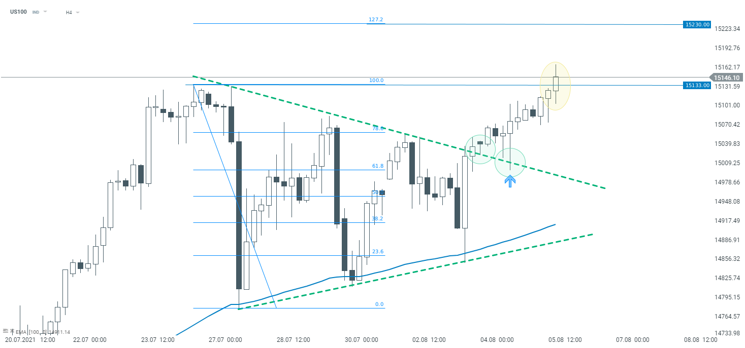 Notowania US100 odwzorowujące kurs amerykańskiego indeksu technologicznego Nasdaq, znalazły się dziś na najwyższych poziomach w historii. Za ruchem w górę mogło przemawiać wybicie z formacji trójkąta, które zgodnie z klasycznymi założeniami analizy technicznej zapowiada kontynuację trendu. Jeżeli obecny sentyment się nie zmieni, niewykluczony jest atak na opór przy 15 230 pkt, który wynika z położenia mierzenia zewnętrznego 127,2% Fibonacciego. US100 interwał D1. Źródło: xStation5