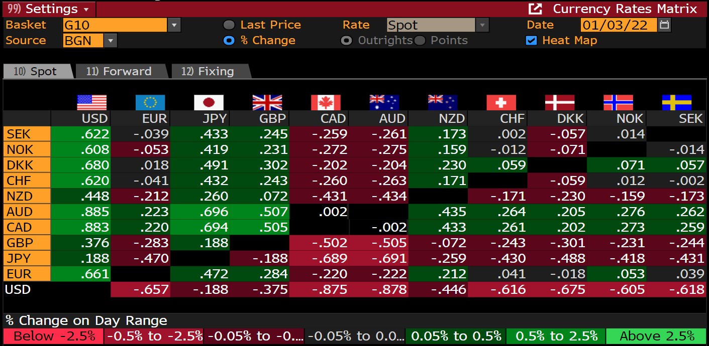 Procentowa zmiana kursów walut G10. Mocne umocnienie dolara na początku 2022 roku. Źródło: Bloomberg