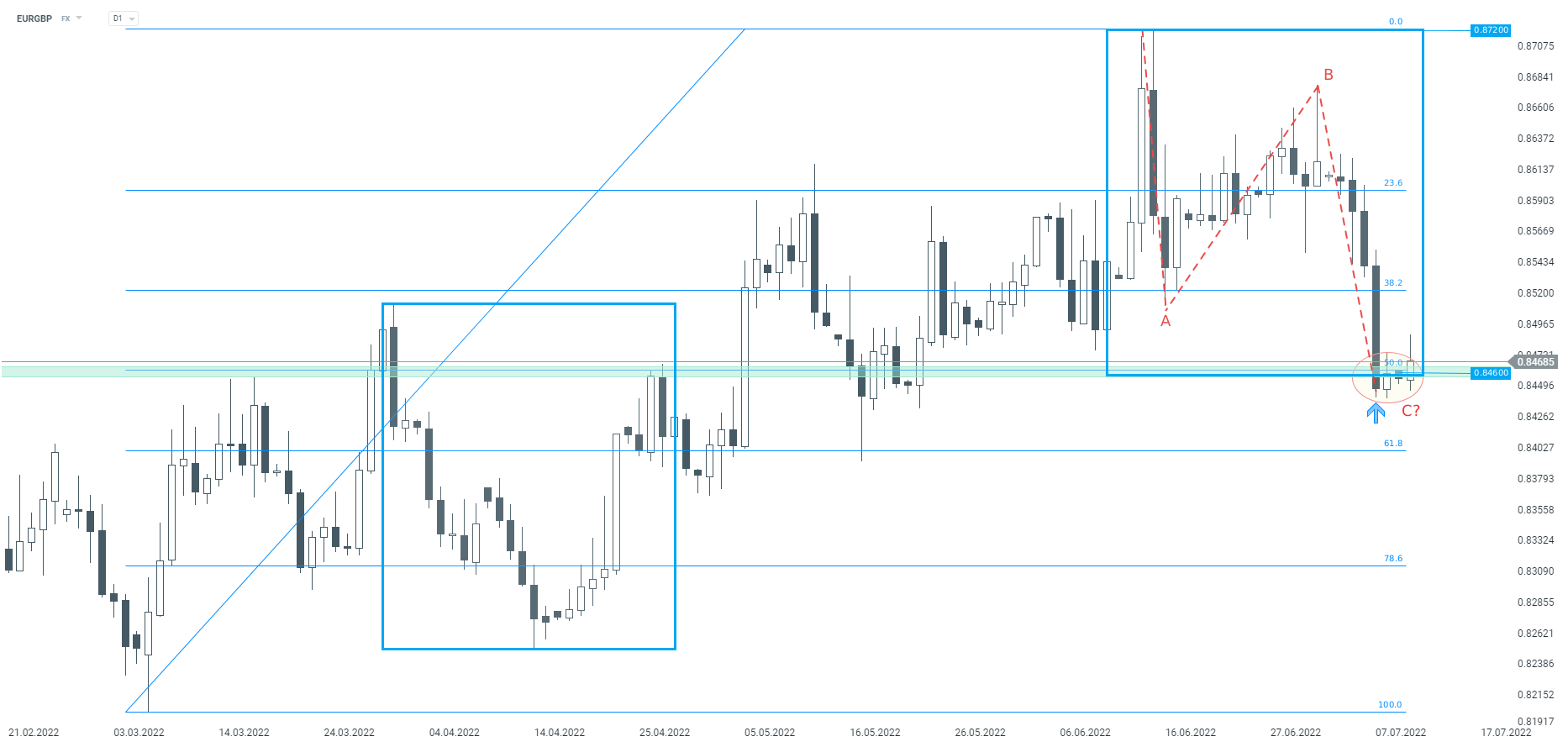 Para walutowa EURGBP próbuje odreagowywać po zeszłotygodniowej przecenie. Patrząc techniczne na wykres dzienny, obserwujemy pojawienie się reakcji kupujących na wysokości wsparcia przy 0,8460. Miejsce to wynika z dolnego ograniczenia szerokiego układu 1:1, mierzenia 50% Fibonacciego oraz wcześniejszych reakcji. Dodatkowo zgodnie z teorią fal Elliota, aktualnie może budować się potencjalna korekta prosta ABC, która wspiera scenariusz wzrostowy. Niemniej jeżeli wspomniane wsparcie przy 0.8460 zostanie zanegowane, przecena może przybrać na sile, a trend może zmienić się na spadkowy. Źródło: xStation5
