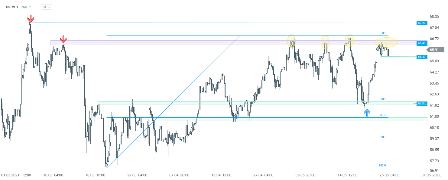 Patrząc z kolei na notowania ropy naftowej, te rozpoczęły sesję od spadków. Niemniej kupujący pojawili się ponownie w rejonach poziomu 65,40$, który pozostaje kluczowym wsparciem w krótkim terminie. Odbicie z jakim mamy do czynienia w drugiej połowie sesji można tłumaczyć lepszymi od oczekiwań danymi o zapasach ropy naftowej, które pokazały większy niż oczekiwano spadek stanów magazynowych “czarnego złota”. Patrząc technicznie na wykres H4, kurs zmaga się w ostatnim czasie ze strefą oporową przy poziomie 66,40$. Jeżeli przeszkoda ta zostanie pokonana, ruch w górę może się przedłużyć w kierunku tegorocznych maksimów przy 67,90$.