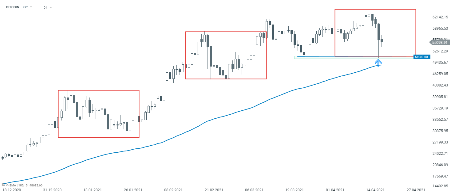 Pomimo dynamicznego cofnięcia na rynku kryptowalut, notowania Bitcoina wyhamowały spadki na wysokości dolnego ograniczenia układu 1:1. Zgodnie z metodologią Overbalance, główny trend pozostaje wzrostowy. Niemniej w przypadku zanegowania wsparcia przy 51000$, rynkowe byki mogą się znaleźć w tarapatach. Źródło: xStation5