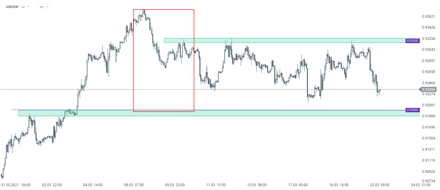 Patrząc technicznie na parę walutową USDCHF, notowania poruszają się od pewnego czasu w konsolidacji. Pod koniec ubiegłego tygodnia sprzedający pojawili się ponownie na wysokości horyzontalnej strefy oporu przy 0,9320, przez co dziś kontynuowane były spadki. Jeżeli obecny sentyment się utrzyma, możliwe jest zejście w kierunku strefy wsparcia przy 0,9200, która wynika z wcześniejszych reakcji ceny jak i szerokiego układu 1:1 z wyższego interwału czasowego. Niemniej dopóki wspomniany poziom 0,92, bądź 0,9320 nie zostanie wybity, notowania mogą trzymać się w ruchu bocznym.