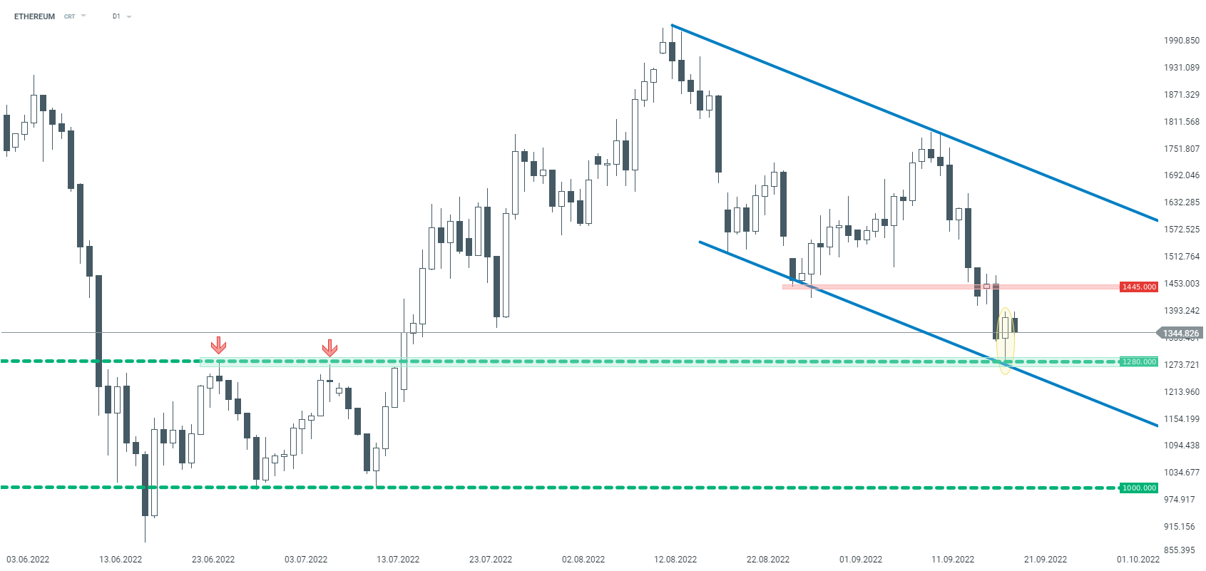 Pomimo iż na wykresie D1 ETHEREUM (podobnie jak na BITCOINie) pojawiła się formacja młota, tak dzisiejsza sesja przynosi kontynuację spadków. Jeżeli wspomniana formacja zostanie zanegowana i cena spadnie poniżej strefy wsparcia przy 1280$, przecena może przybrać na sile. Kolejne ważne wsparcie wypada dopiero przy okrągłym poziomie 1000$. Ważny opór znajduje się z kolei przy poziomie 1445$. Źródło: xStation5