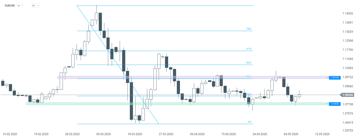 Główna para walutowa pozostaje w konsolidacji. Na interwale D1 pojawiła się wczoraj formacja zapowiadająca wzrosty, dlatego też bazowym scenariuszem pozostaje konsolidacja pomiędzy poziomem 1,0760, a 1,0970. Źródło: xStation5