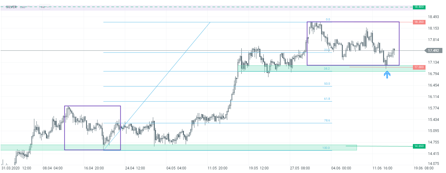 Srebro kontynuuje powolną wspinaczkę na wyższe poziomy, po tym jak wczoraj doszło do obrony kluczowego wsparcia w rejonach okrągłego poziomu 17$. Źródło: xStation5