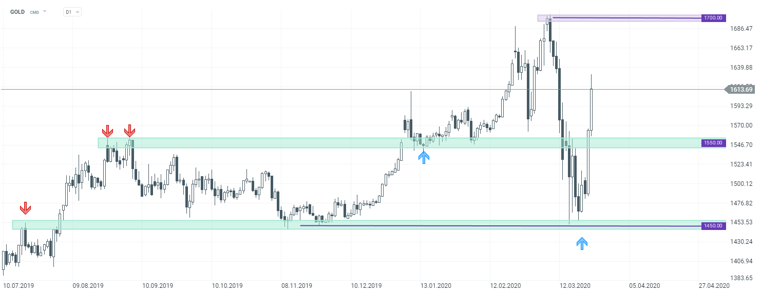 Wzrosty na złocie przekroczyły dziś 4%, tym samym kontynuowane jest odbicie, z którym mamy do czynienia od 19 marca. Pokonanie poziomu 1550$ sugeruje możliwy atak nawet na tegoroczne maksima przy 1700$. Źróło: xStation5