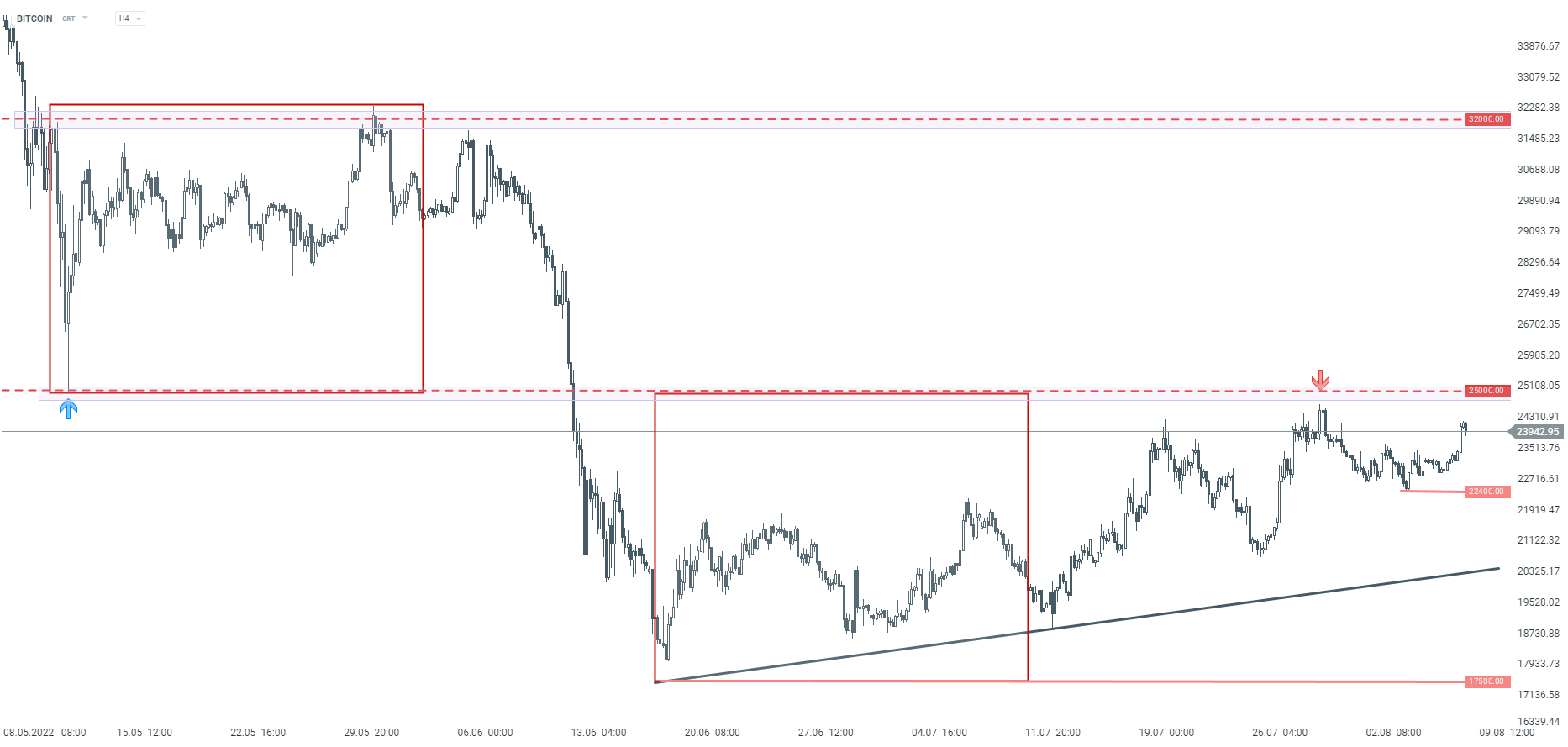 Notowania Bitcoina rozpoczęły tydzień od wzrostów. Patrząc technicznie na wykres H4, jeśli obecny impet się utrzyma - niewykluczony jest ponowny atak na kluczowy opór przy poziomie 25000$. Strefa przy wspomnianym poziomie wynika z dołka z 12 maja oraz górnego ograniczenia szerokiego układu 1:1: Jeśli natomiast dojdzie do spadków, jako pierwsze wsparcie należy traktować poziom 22400$. Źródło: xStation5