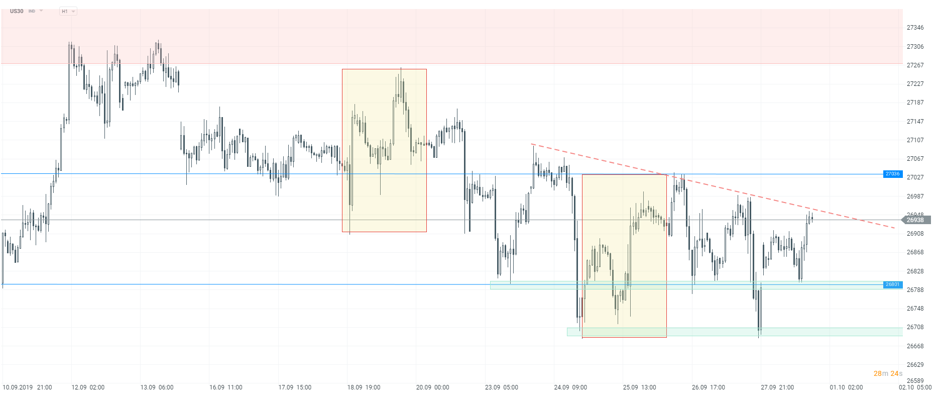 Z kolei indeksy w USA rozpoczęły dzisiejszą sesję od umiarkowanych wzrostów. Ruch w górę jest kontynuowany w kolejnych godzinach. Przed 20:00 najmocniej rośnie NASDAQ, blisko 0,8%. Z kolei Dow Jones i S&P500 rosną odpowiednio 0,56% i 0,66%. Patrząc na niższy interwał czasowy, wzrosty mieszczą się w wąskim zakresie konsolidacji, jaką mogliśmy obserwować pod koniec ubiegłego tygodnia. Aby określić kierunek należy więc poczekać na bardziej zdecydowane ruchy. Na interwale H1 kluczowym oporem dla Dow Jones (US30) jest poziom 27036 pkt, gdzie znajduje się górne ograniczenie lokalnego układu 1:1. Wsparciem jest z kolei poziom 26800, gdzie znajdują się dzisiejsze minima.