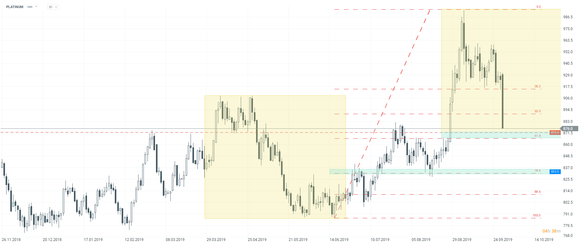 Cena platyny tonie, kurs zbliża się do wsparcia technicznego przy poziomie 872,00, interwał D1. Źródło: xStation5