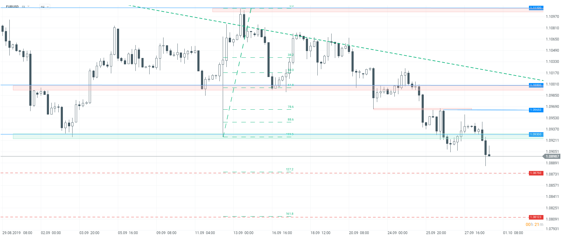 Kurs euro kontynuuje spadki, mierzenia zewnętrzne Fibonacciego w zasięgu, interwał H4. Źródło: xStation5