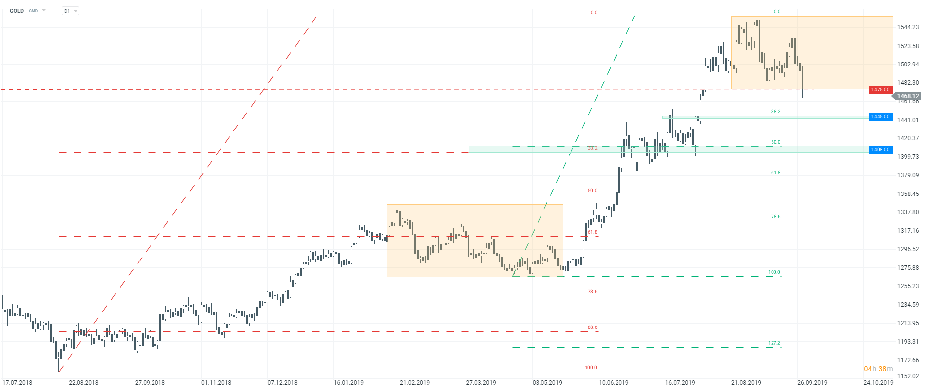 Złoto mocno w dół, szansa na realizację formacji RGR, interwał D1. Źródło: xStation5