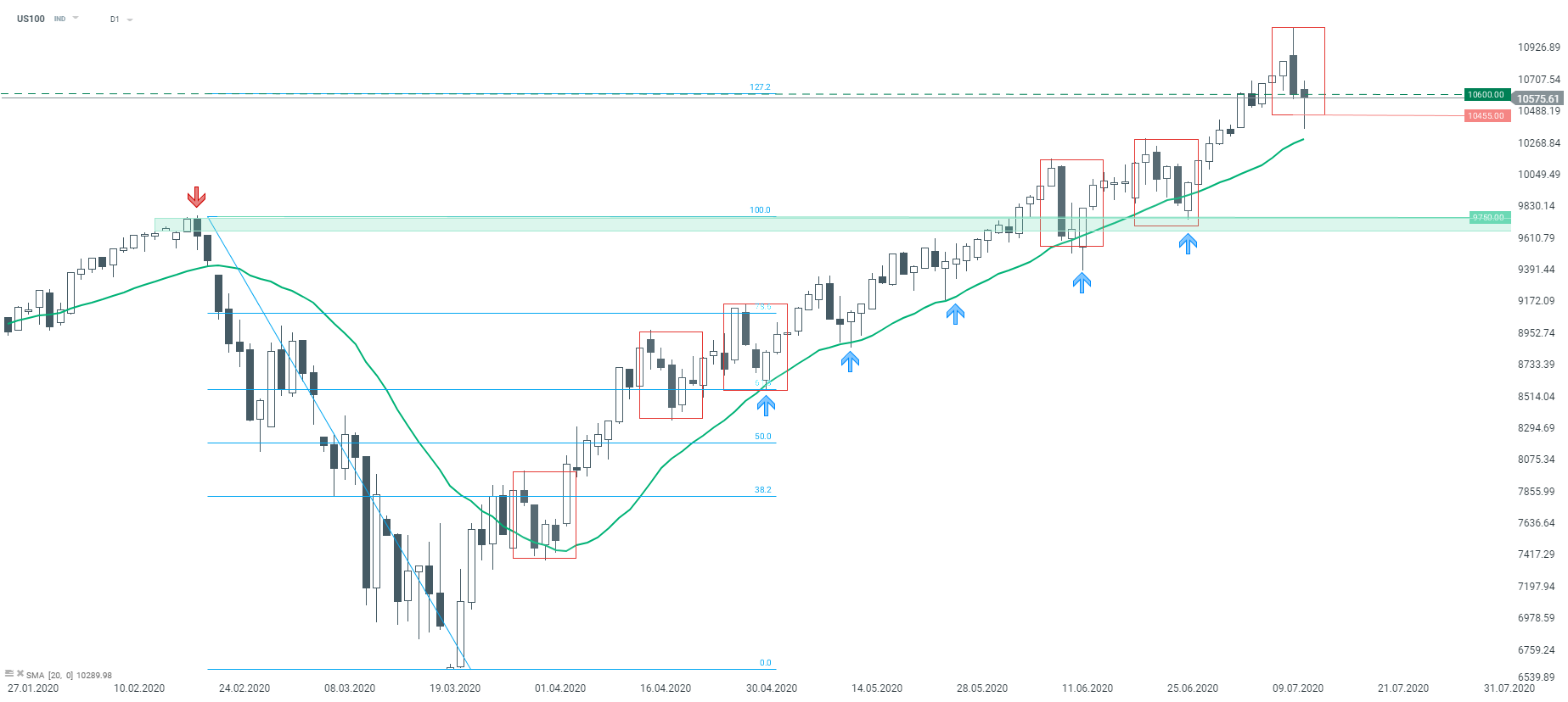 Amerykański indeks technologiczny odbija od dolnego ograniczenia układu 1:1. Dopóki nie zostanie on zanegowany, trend wzrostowy obowiązuje. Większej przeceny można się spodziewać dopiero po zejściu poniżej średniej SMA20, która została zaznaczona kolorem zielonym. Źródło: xStation5