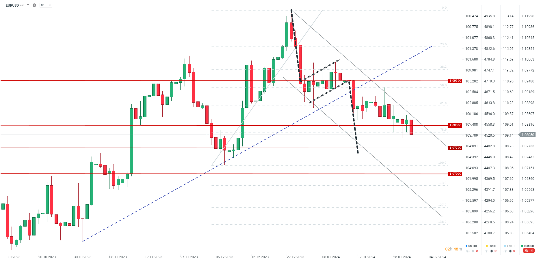 - Powell stwierdził jednak, że przy obecnych danych marzec jest raczej wykluczony pod względem obniżki, co doprowadziło EURUSD ponownie w okolice 1,0800.