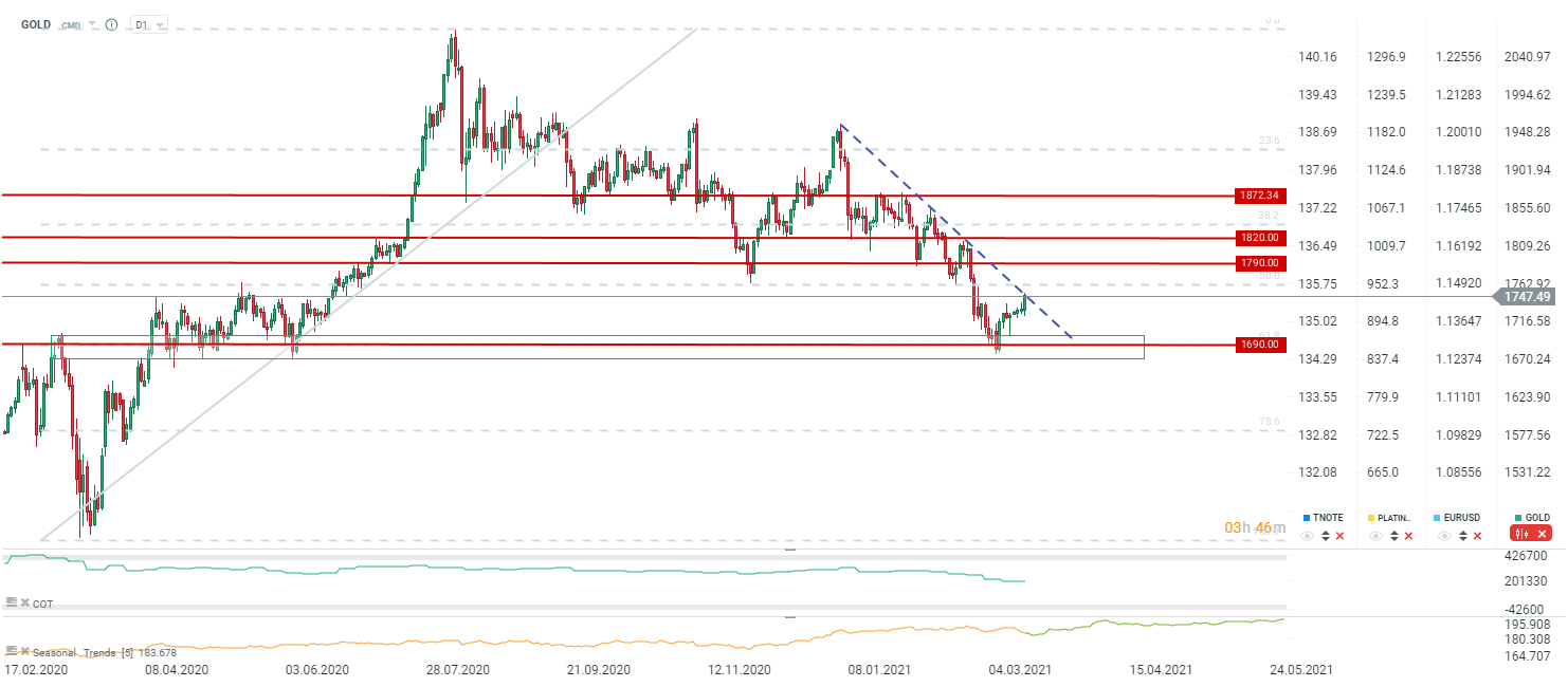 Złoto przy 1750 przy oporze w postaci spadkowej linii trendu. Źródło: xStation5