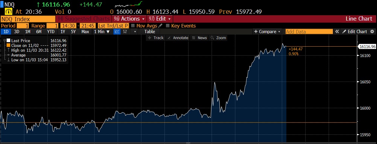 Nasdaq-100 (US100) odbił się podczas konferencji prasowej Powella i po raz pierwszy w historii przekroczył granicę 16 000 pkt. Rynki z zadowoleniem przyjęły umiarkowane tempo taperingu i raczej gołębie wytyczne dotyczące stóp. Źródło: Bloomberg