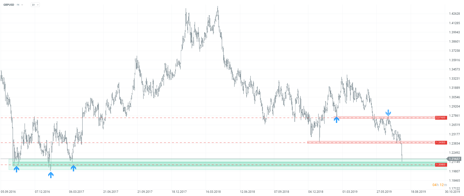Jeżeli chodzi o rynek walutowy, skupić należy się głównie na funcie brytyjskim. Pomimo, że dzisiejsze spadki nie były tak spektakularne jak wczoraj, to i tak funt zanurkował dziś blisko 0,5% (wczoraj ruch w dół wyniósł ponad 1,3%). Tak duża przecena sprawdziła kurs GBPUSD na minima ze stycznia 2016 roku. Kluczową strefą wsparcia pozostają okolice poziomu 1,2080. Jeżeli zostałby on pokonany, to spadki mogą dopiero przybrać na sile. Biorąc jednak pod uwagę statystykę, po tak silnym ruchu spadkowym powinna pojawić się korekta wzrostowa. Niemniej rynek w pewnych okresach czasu odchyla się od średniej , a sytuacja fundamentalna nie jest dobra. Nowy rząd Borisa Johnsona jest skłonny wyjść z Unii Europejskiej bez porozumienia. Premier UK planuje rozpocząć kampanię informacyjną, która ma za zadanie przygotować obywateli na konsekwencje opuszczenia UE. Kampania ma kosztować budżet nawet 100 milionów funtów. Rynkowi nie spodobały się te informacje, jeżeli nowy rząd w dalszym ciągu będzie podtrzymał swoją retorykę, to niewykluczone, że spadki na funcie będą kontynuowane. Jeżeli jednak na GBPUSD pojawiały się korekta wzrostowa, to kluczowym miejscem, które powinno być broniony przez sprzedających jest strefa przy 1,2450.