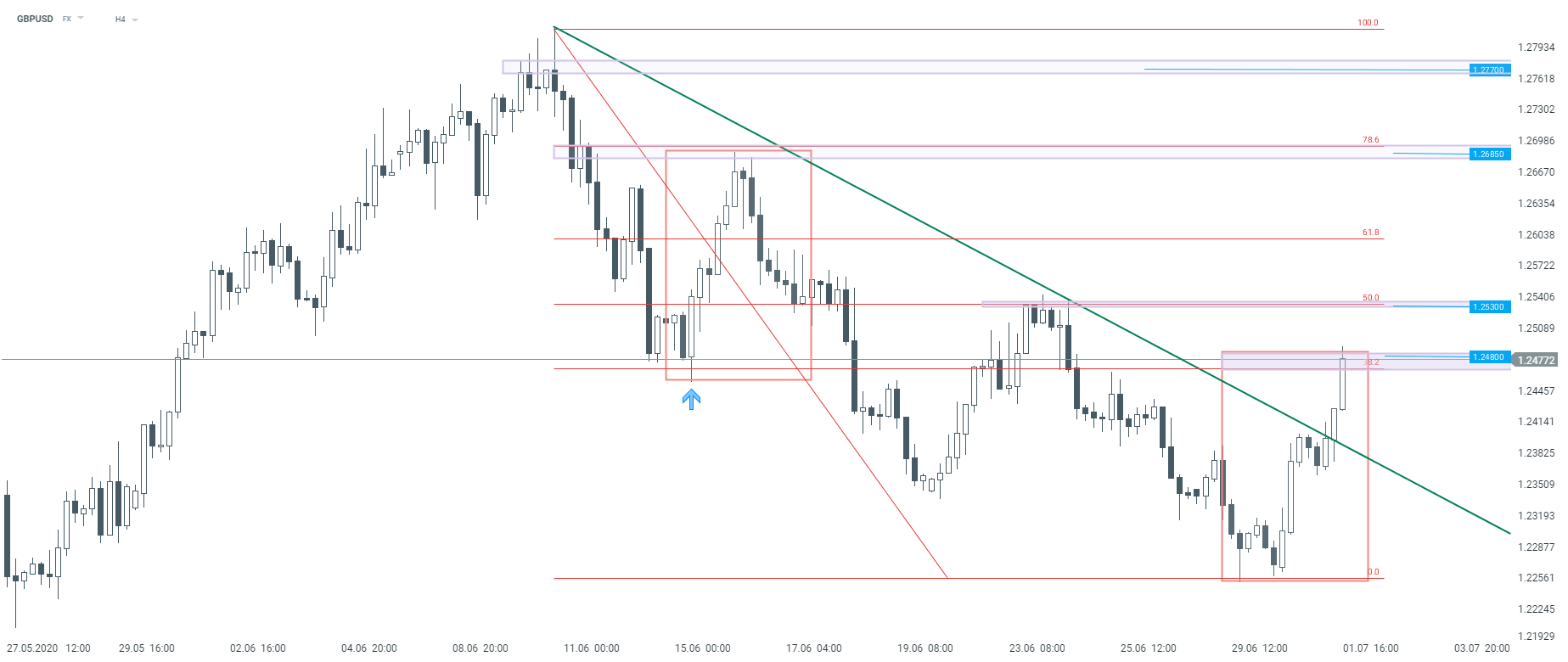 Notowania GBPUSD dotarły do oporu wynikającego z mierzenia 38,2% Fibonacciego oraz geometrii 1:1. Na razie nie widać reakcji sprzedających, a jeżeli sentyment się utrzyma i dojdzie do wybicia górą - droga do dalszej zwyżki zostanie otwarta. Źródło: xStation5