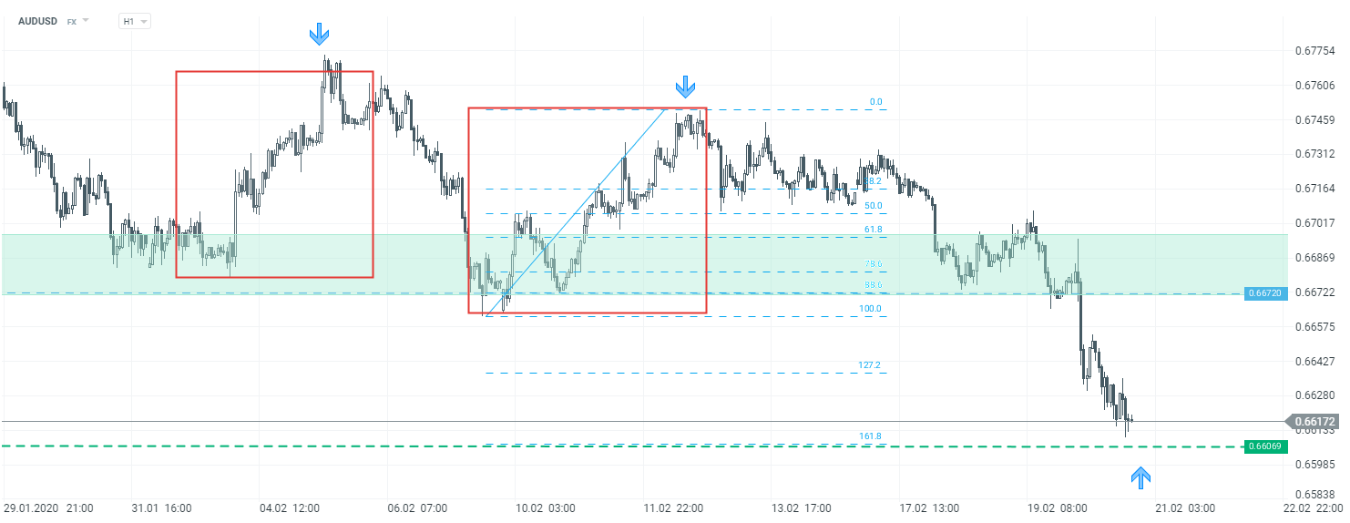 Po wybiciu dołem strefy przy 0,6680, kurs AUDUSD znalazł się na najniższych poziomach od 2009 roku. Patrząc na interwał H4, najbliższe krótkoterminowe wsparcie może stanowić zniesienie zewnętrzne 161,8% Fibonacciego. Należy jednak pamiętać, że główny trend pozostaje spadkowy. Źródło: xStation5