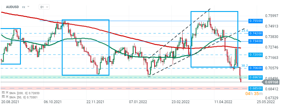 Para AUDUSD porusza się na południe czwarty dzień z rzędu i dziś przełamała się poniżej kolejnego ważnego wsparcia na poziomie 0,6965, gdzie znajdują się minima ze stycznia 2022 roku. Jeśli obecny sentyment się utrzyma, następny cel dla sprzedających można znaleźć w okolicach wsparcia przy 0,6850, które jest zaznaczone poprzednimi reakcjami cenowymi. Źródło: xStaion 5