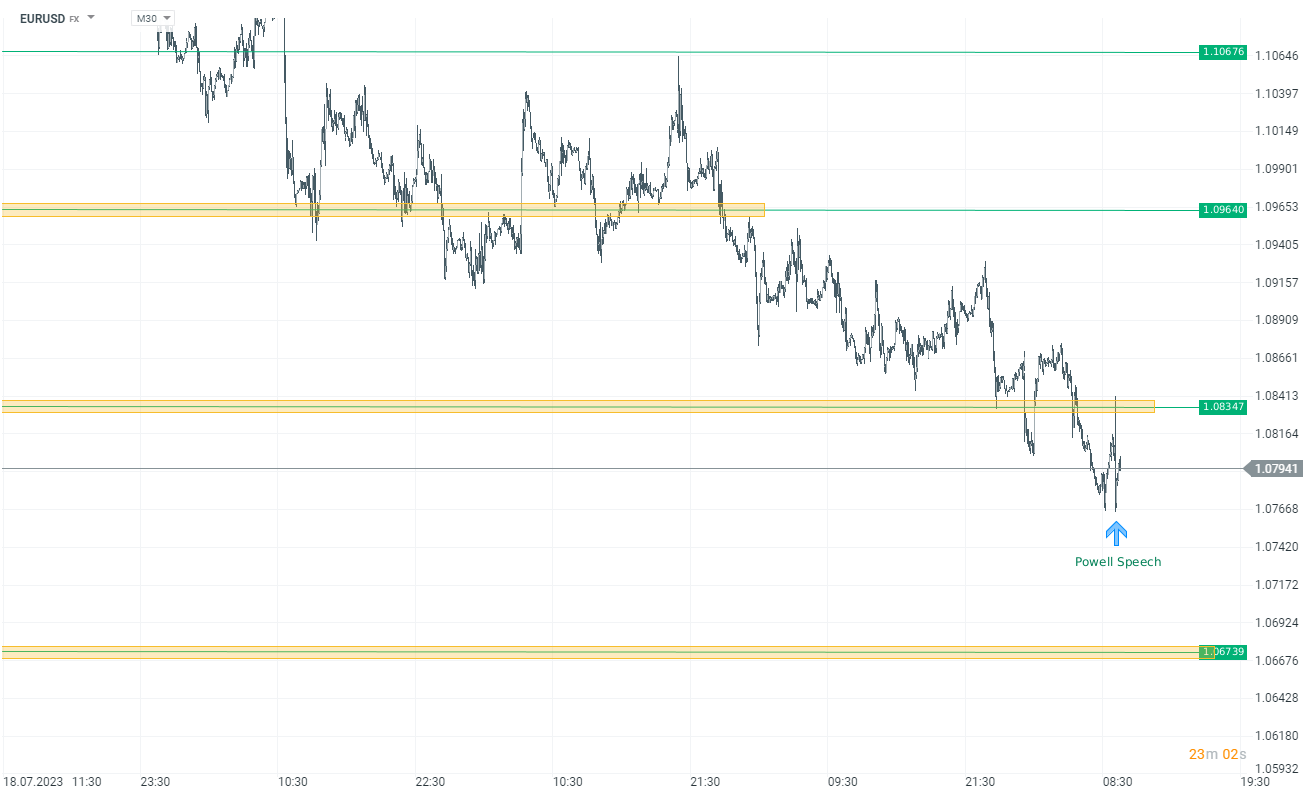 EURUSD odbija od 1,075 i wraca powyżej 1,08 po dynamicznych spadkach zapoczątkowanych w czasie przemówienia Powella. Indeks dolara utrzymuje się powyżej 104,8 punktów