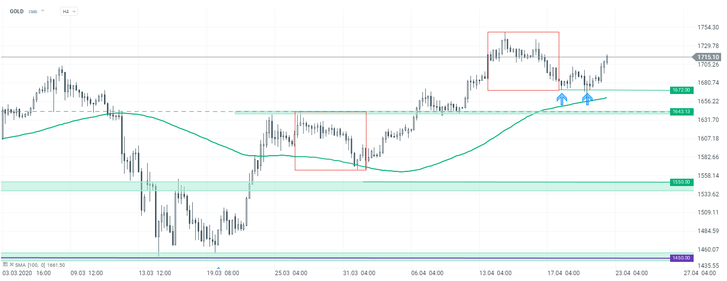 Zgodnie z ostatnimi założeniami, notowania złota odbiły się od dolnego ograniczenia układu Overbalance. Poziom 1672$ pozostaje kluczowym wsparciem w krótkim terminie. Tak długo jak notowania znajdują się powyżej, możliwy jest atak na ostatnie maksima. Źródło: xStation5