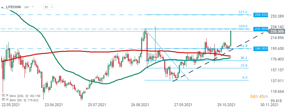 Cena LITECOIN podskoczyła o ponad 14% podczas dzisiejszej sesji w związku z pozytywnymi nastrojami na rynku i obecnie zbliża się do oporu na poziomie $231.00, gdzie znajduje się wrześniowe maksimum. Jeśli dojdzie do przełamania tego poziomu, ruch w górę może przyspieszyć w kierunku 256,55 USD. Z drugiej strony, jeśli sprzedającym uda się odzyskać kontrolę, wówczas najbliższe wsparcie znajduje się na poziomie 196,00 USD. Źródło: xStation 5