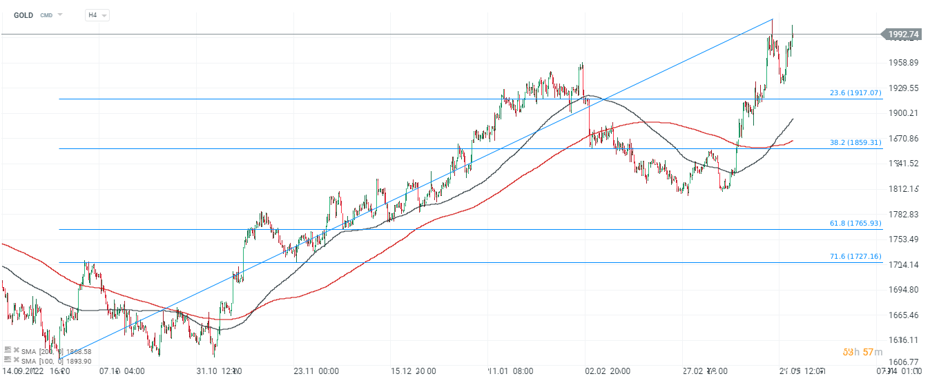GOLD, interwał H4. Cena złota osiągnęła dziś ponownie poziom 2000 USD, choć sprzedający uaktywnili się po komentarzach Janet Yellen, która wskazała że jeśli zajdzie potrzeba, dla banków znajdzie się dodatkowa płynność. W okolicach 2000 USD powstała niedźwiedzia formacja podwójnego szczytu, choć przecięcie SMA200 od dołu przez SMA100 tzw. złoty krzyż wskazuje na dłuższy powrót pozytywnego sentymentu. Źródło: xStation5