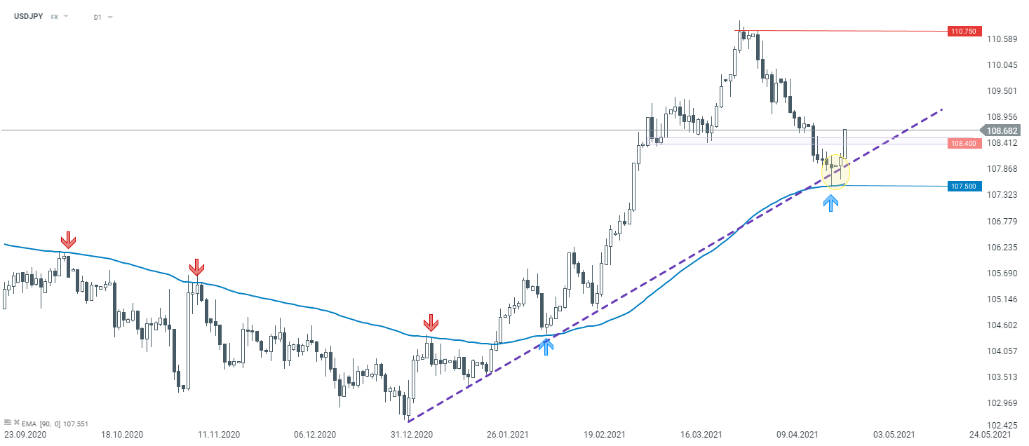 Patrząc technicznie na wykres USDJPY, wczoraj na interwale D1 pojawiła się formacja pin bara, która zainicjowała dzisiejszy ruch w górę. Notowania zdołały pokonać strefę oporową przy 108,40, przez co istnieje szansa na kontynuację ruchu w ramach trendu wzrostowego. Zgodnie z zasadą biegunowości, wspomniany poziom powinien w krótkim terminie być traktowany jako wsparcie.