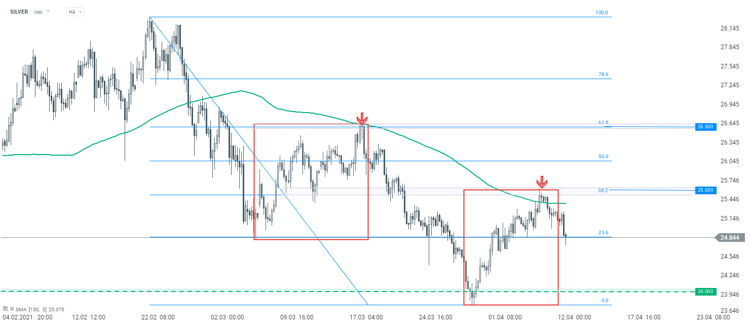 Patrząc na sytuację techniczną, notowania srebra odbiły się pod koniec ubiegłego tygodnia od strefy oporowej przy 25,60$, a po weekendzie ruch w dół jest kontynuowany. Jeżeli obecny sentyment nie ulegnie zmianie, niewykluczone jest pogłębienie ruchu w kierunku ostatnich minimów przy 24,00$.