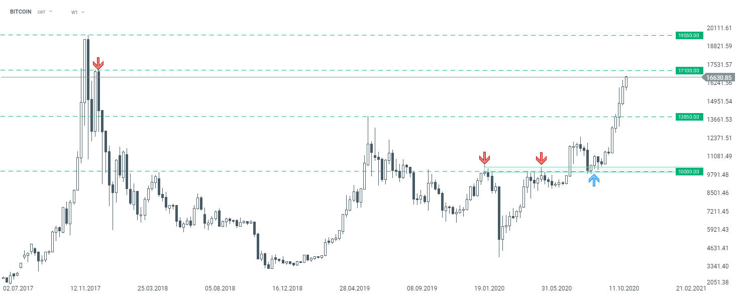 Bitcoin ma za sobą dobrą passę, główna kryptowaluta rośnie kolejny tydzień z rzędu. Patrząc na wykres tygodniowy, notowanis zbliżają się do oporu, który skutecznie powstrzymał wzrosty w styczniu 2018 roku. Niemniej na razie brakuje jakichkolwiek sygnałów sugerujących spadki. W przypadku wybicia górą, niewykluczone jest przyspieszenie ruchu w kierunku północnym.