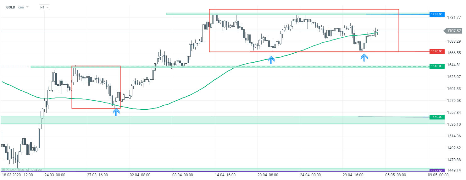 Pomimo, że w ostatnim czasie na rynku złota obserwujemy konsolidację, to kurs ponownie odbił od dolnego ograniczenia układu Overbalance przy 1670$ za uncję. Po reakcji popytowej, dziś notowania wychodzą powyżej średniej SMA100, co może sugerować dalszą zwyżkę i atak na ostatnie szczyty przy 1728$. Źródło: xStation5