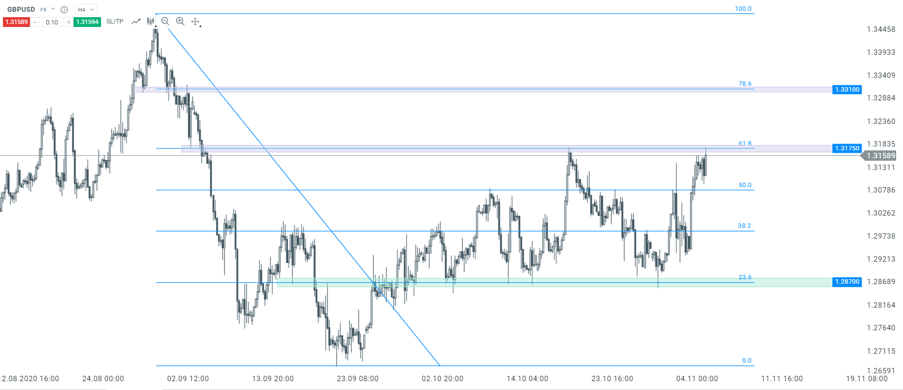 Patrząc na interwał H4, kurs GBPUSD testuje właśnie kluczowy opór przy poziomie 1,3175. Miejsce to wynika z wcześniejszych reakcji ceny, jak i mierzenia 61,8% ostatniej fali spadkowej. W przypadku wybicia górą, należy spodziewać się ruchu w kierunku poziomu 1,3310. Źródło: xStation5