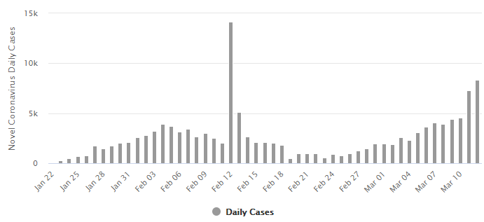 O ile w ostatnim czasie przyzwyczailiśmy się, że liczba przypadków koronawirusa na całym świecie rośnie, tak w tym tygodniu zaczęło robić się naprawdę gorąco, szczególnie w Europie. W minionych dwóch dniach odnotowany został lawinowy wzrost zgonów, jak i zarejestrowanych przypadków. Z kolei jak wynika z najnowszych, wieczornych danych, dzisiejszy dzień ponownie będzie rekordowy, po godzinie 19:30 odnotowano już 8382 przypadki a wczoraj było to 8363 . Warto też wziąć pod uwagę fakt, że nie zostały jeszcze opublikowane dane z Francji, dlatego ostateczna ilość z pewnością będzie wyższa. Na poniższym wykresie pominięty został skok z 12 lutego, który spowodowany zmianą sposobu liczenia i kwalifikowania chorych w Chinach.