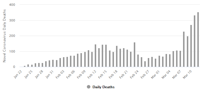 Kolejne rekordy widać także w liczbie zgonów. Poniższy wykres prezentuje sytuację na dzień wczorajszy, kiedy odnotowano 354 zgony. Z kolei dziś mówi się już o 401 ofiarach śmiertelnych (250 w samych Włoszech), co oznacza kolejny największy przyrost od czasu wybuchu epidemii. W naszym kraju mamy do czynienia “tylko” z 68 potwierdzonymi przypadkami koronawirusa i 1 zgonem.