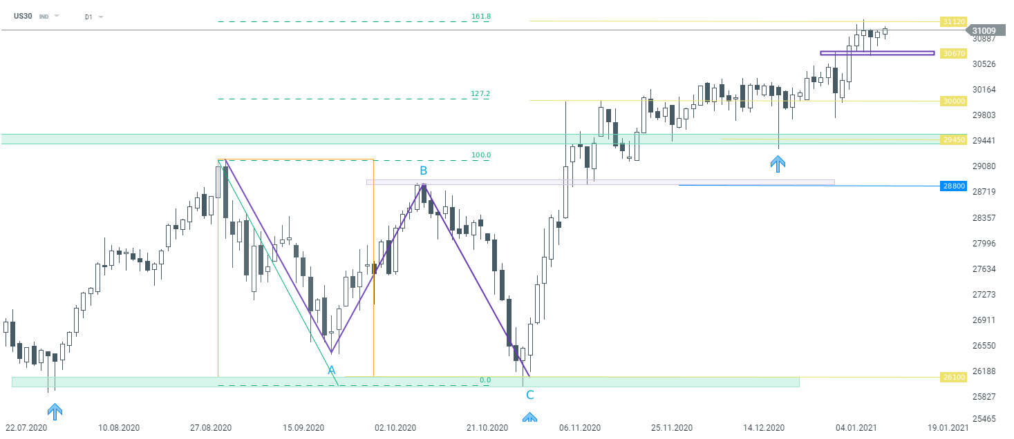 Od kilku sesji na rynku akcji w USA utrzymuje się ruch boczny. Patrząc na US30, oporem pozostaje przetestowane mierzenie 161,8% FIbonacciego przy 31120 pkt. Niemniej aby mówić o korekcie spadkowej, kurs musiałby cofnąć przynajmniej poniżej poziomu lokalnej sekwencji wzrostowej, która znajduje się przy 30670 pkt. Źródło. xStation5.
