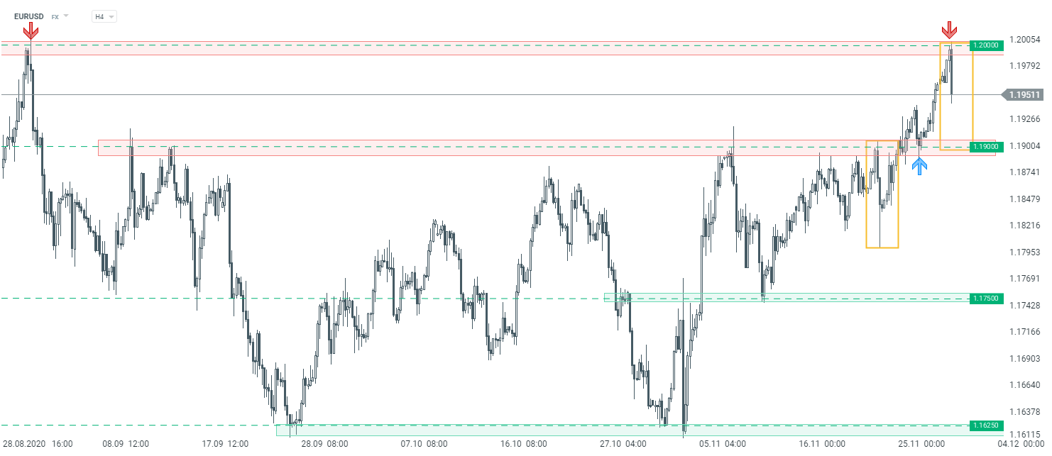 EURUSD odbija od oporu przy okrągłym poziomie 1,20 USD. Źródło: xStation5